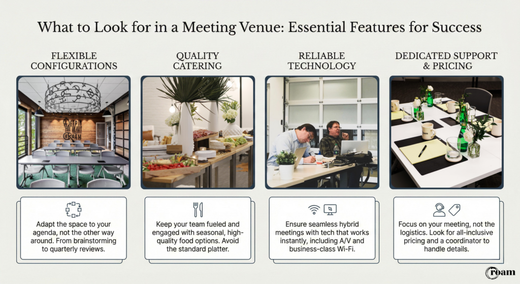 What really sets Roam apart is the personal touch. Every booking comes with a dedicated Meeting Coordinator who handles the details from start to finish, from room configuration and tech setup to curated add-on packages that can include everything from brainstorming kits to custom team experiences. It’s the kind of stress-free planning that makes you look good without requiring hours of your own time.